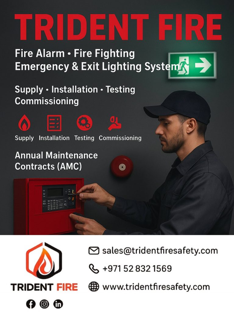 🔥 TRIDENT FIRE 🔥 ✅ Supply • Installation • Testing • Commissioning Fire Alarm Fire Fighting System Emergency & Exit Lighting System 🛠 Annual Maintenance Contractors (AMC) 📞 Trusted Solutions for Safety & Protection ☎️Phone: +971 52 832 1569 📩Email: sales@tridentfiresafety.com 🌐Website: www.tridentfiresafety.com #TridentFire #FireSafety #FireAlarm #FireFighting #EmergencyLighting #ExitLighting #FireProtection #FireExtinguisher #FireSystem #SafetyFirst #FireSafetyUAE #DubaiSafety […]